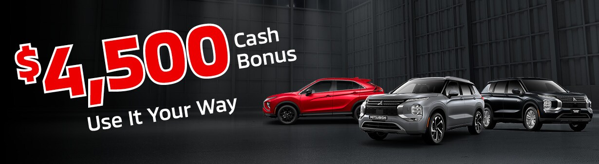 We are the only Mitsubishi in the DFW giving you a $4,500 cash bonus on all new Mitsubishi models. That's real money back in your pocket to use it your way! - As a down payment, to cover negative equity, or keep the cash. Hurry, this limited-time offer won't last long!
