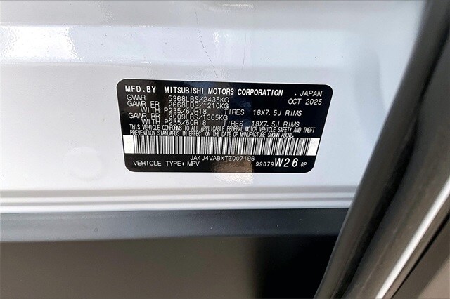 4WD, 3rd row seats: split-bench, 4-Wheel Disc Brakes, 8 Speakers, ABS brakes, Air Conditioning, Alloy wheels, AM/FM radio: SiriusXM, Android Auto & Apple CarPlay, Auto High-beam Headlights, Auto-dimming Rear-View mirror, Automatic temperature control, Brake assist, Bumpers: body-color, Compass, Delay-off headlights, Driver door bin, Driver vanity mirror, Dual front impact airbags, Dual front side impact airbags, Electronic Stability Control, Emergency communication system: Mitsubishi Connect w/ 24-month trial, Exterior Parking Camera Rear, Four wheel independent suspension, Front anti-roll bar, Front Bucket Seats, Front Center Armrest w/Storage, Front dual zone A/C, Front fog lights, Front reading lights, Fully automatic headlights, Headlight cleaning, Heated door mirrors, Heated Front Bucket Seats, Heated front seats, Illuminated entry, Knee airbag, Leather Shift Knob, Leather steering wheel, Low tire pressure warning, Navigation System, Occupant sensing airbag, Outside temperature display, Overhead airbag, Overhead console, Panic alarm, Passenger door bin, Passenger vanity mirror, Power door mirrors, Power driver seat, Power Liftgate, Power steering, Power windows, Radio data system, Radio: AM/FM 12.3" Navigation with Smartphone-Link, Rain sensing wipers, Rear anti-roll bar, Rear seat center armrest, Rear side impact airbag, Rear window defroster, Rear window wiper, Reclining 3rd row seat, Remote keyless entry, Security system, Speed control, Speed-Sensitive Wipers, Split folding rear seat, Spoiler, Steering wheel mounted audio controls, Synthetic Leather Seating Surfaces, Tachometer, Telescoping steering wheel, Tilt steering wheel, Traction control, Trip computer, Turn signal indicator mirrors, and Variably intermittent wipers.