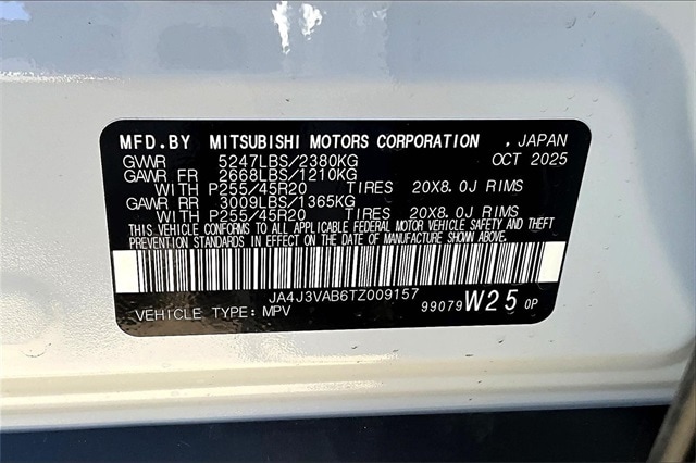 3rd row seats: split-bench, 4-Wheel Disc Brakes, 8 Speakers, ABS brakes, Air Conditioning, Alloy wheels, AM/FM radio: SiriusXM, Android Auto & Apple CarPlay, Auto High-beam Headlights, Auto-dimming Rear-View mirror, Automatic temperature control, Brake assist, Bumpers: body-color, Compass, Delay-off headlights, Driver door bin, Driver vanity mirror, Dual front impact airbags, Dual front side impact airbags, Electronic Stability Control, Emergency communication system: Mitsubishi Connect w/ 24-month trial, Exterior Parking Camera Rear, Four wheel independent suspension, Front anti-roll bar, Front Bucket Seats, Front Center Armrest w/Storage, Front dual zone A/C, Front fog lights, Front reading lights, Fully automatic headlights, Garage door transmitter: HomeLink, Heated door mirrors, Heated Front Bucket Seats, Heated front seats, Illuminated entry, Knee airbag, Leather Shift Knob, Leather steering wheel, Low tire pressure warning, Navigation System, Occupant sensing airbag, Outside temperature display, Overhead airbag, Overhead console, Panic alarm, Passenger door bin, Passenger vanity mirror, Power door mirrors, Power driver seat, Power Liftgate, Power steering, Power windows, Radio data system, Radio: AM/FM 12.3" Navigation with Smartphone-Link, Rain sensing wipers, Rear anti-roll bar, Rear seat center armrest, Rear side impact airbag, Rear window defroster, Rear window wiper, Reclining 3rd row seat, Remote keyless entry, Security system, Speed control, Speed-Sensitive Wipers, Split folding rear seat, Spoiler, Steering wheel mounted audio controls, Synthetic Leather Seating Surfaces, Tachometer, Telescoping steering wheel, Tilt steering wheel, Traction control, Trip computer, Turn signal indicator mirrors, Variably intermittent wipers, and Wheels: 20" Two-Tone Alloy.