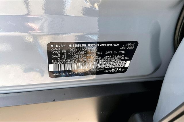 3rd row seats: split-bench, 4-Wheel Disc Brakes, 8 Speakers, ABS brakes, Air Conditioning, Alloy wheels, AM/FM radio: SiriusXM, Android Auto & Apple CarPlay, Auto High-beam Headlights, Auto-dimming Rear-View mirror, Automatic temperature control, Brake assist, Bumpers: body-color, Compass, Delay-off headlights, Driver door bin, Driver vanity mirror, Dual front impact airbags, Dual front side impact airbags, Electronic Stability Control, Emergency communication system: Mitsubishi Connect w/ 24-month trial, Exterior Parking Camera Rear, Four wheel independent suspension, Front anti-roll bar, Front Bucket Seats, Front Center Armrest w/Storage, Front dual zone A/C, Front fog lights, Front reading lights, Fully automatic headlights, Garage door transmitter: HomeLink, Heated door mirrors, Heated Front Bucket Seats, Heated front seats, Illuminated entry, Knee airbag, Leather Shift Knob, Leather steering wheel, Low tire pressure warning, Navigation System, Occupant sensing airbag, Outside temperature display, Overhead airbag, Overhead console, Panic alarm, Passenger door bin, Passenger vanity mirror, Power door mirrors, Power driver seat, Power Liftgate, Power steering, Power windows, Radio data system, Radio: AM/FM 12.3" Navigation with Smartphone-Link, Rain sensing wipers, Rear anti-roll bar, Rear seat center armrest, Rear side impact airbag, Rear window defroster, Rear window wiper, Reclining 3rd row seat, Remote keyless entry, Security system, Speed control, Speed-Sensitive Wipers, Split folding rear seat, Spoiler, Steering wheel mounted audio controls, Synthetic Leather Seating Surfaces, Tachometer, Telescoping steering wheel, Tilt steering wheel, Traction control, Trip computer, Turn signal indicator mirrors, Variably intermittent wipers, and Wheels: 20" Two-Tone Alloy.