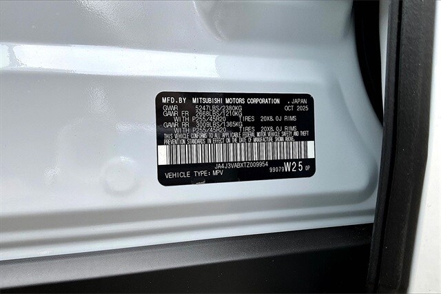 3rd row seats: split-bench, 4-Wheel Disc Brakes, 8 Speakers, ABS brakes, Air Conditioning, Alloy wheels, AM/FM radio: SiriusXM, Android Auto & Apple CarPlay, Auto High-beam Headlights, Auto-dimming Rear-View mirror, Automatic temperature control, Brake assist, Bumpers: body-color, Compass, Delay-off headlights, Driver door bin, Driver vanity mirror, Dual front impact airbags, Dual front side impact airbags, Electronic Stability Control, Emergency communication system: Mitsubishi Connect w/ 24-month trial, Exterior Parking Camera Rear, Four wheel independent suspension, Front anti-roll bar, Front Bucket Seats, Front Center Armrest w/Storage, Front dual zone A/C, Front fog lights, Front reading lights, Fully automatic headlights, Garage door transmitter: HomeLink, Heated door mirrors, Heated Front Bucket Seats, Heated front seats, Illuminated entry, Knee airbag, Leather Shift Knob, Leather steering wheel, Low tire pressure warning, Navigation System, Occupant sensing airbag, Outside temperature display, Overhead airbag, Overhead console, Panic alarm, Passenger door bin, Passenger vanity mirror, Power door mirrors, Power driver seat, Power Liftgate, Power steering, Power windows, Radio data system, Radio: AM/FM 12.3" Navigation with Smartphone-Link, Rain sensing wipers, Rear anti-roll bar, Rear seat center armrest, Rear side impact airbag, Rear window defroster, Rear window wiper, Reclining 3rd row seat, Remote keyless entry, Security system, Speed control, Speed-Sensitive Wipers, Split folding rear seat, Spoiler, Steering wheel mounted audio controls, Synthetic Leather Seating Surfaces, Tachometer, Telescoping steering wheel, Tilt steering wheel, Traction control, Trip computer, Turn signal indicator mirrors, Variably intermittent wipers, and Wheels: 20" Two-Tone Alloy.