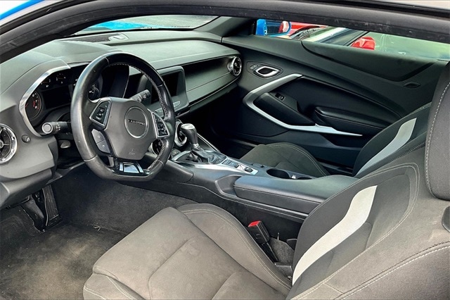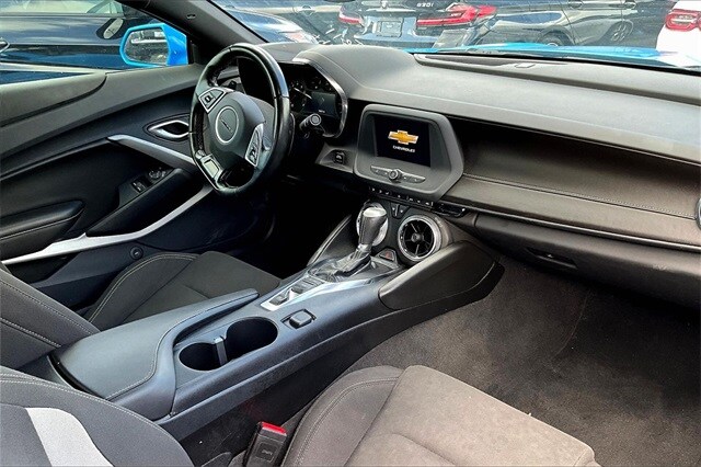 4-Wheel Disc Brakes, 6 Speakers, 6-Speaker Audio System Feature, 8-Way Power Driver Seat Adjuster, ABS brakes, Air Conditioning, All-Weather Cargo Mat w/Camaro Logo (LPO), All-Weather Floor Mats, Alloy wheels, Apple CarPlay/Android Auto, Automatic temperature control, Bluetooth® For Phone, Brake assist, Bumpers: body-color, Cargo Net, Cloth Seat Trim, Compass, Delay-off headlights, Driver door bin, Driver vanity mirror, Dual front impact airbags, Dual front side impact airbags, Electronic Stability Control, Exterior Parking Camera Rear, Four wheel independent suspension, Front anti-roll bar, Front Bucket Seats, Front Center Armrest, Front License Plate Bracket, Front reading lights, Front Sport Bucket Seats, Fully automatic headlights, Illuminated entry, Knee airbag, Leather Shift Knob, Low tire pressure warning, Occupant sensing airbag, Overhead airbag, Paddle-Shift Manual Controls, Panic alarm, Passenger door bin, Passenger vanity mirror, Power door mirrors, Power driver seat, Power passenger seat, Power steering, Power windows, Premium audio system: Chevrolet Infotainment System, Radio data system, Radio: Chevrolet Infotainment 3 System, Rear anti-roll bar, Rear window defroster, Remote keyless entry, Remote Vehicle Starter System, Security system, Speed control, Speed-sensing steering, Steering wheel mounted audio controls, Tachometer, Telescoping steering wheel, Tilt steering wheel, Tire Inflation Kit, Traction control, Trip computer, Variably intermittent wipers, and Voltmeter. 22/30 City/Highway MPG
