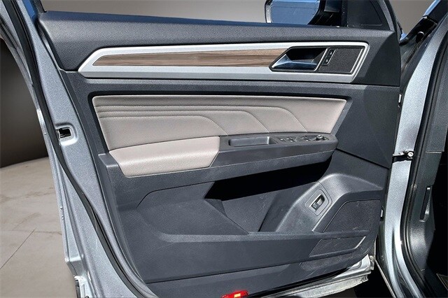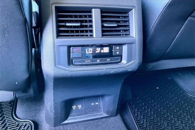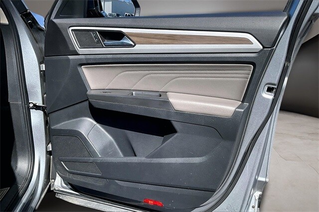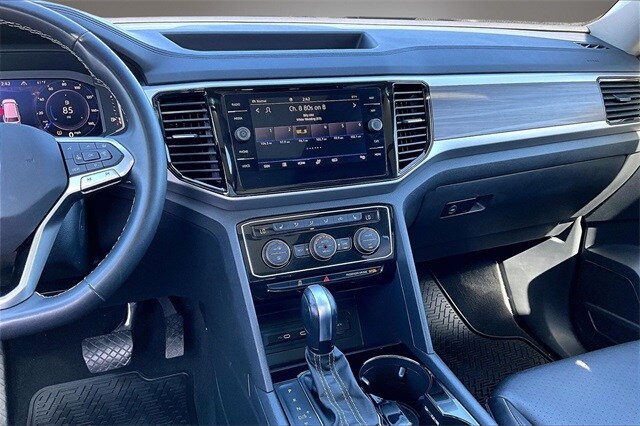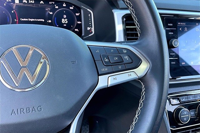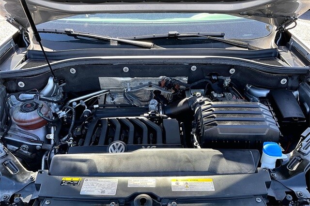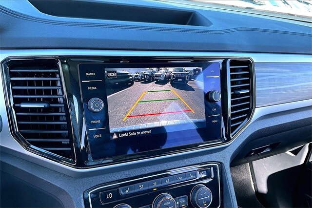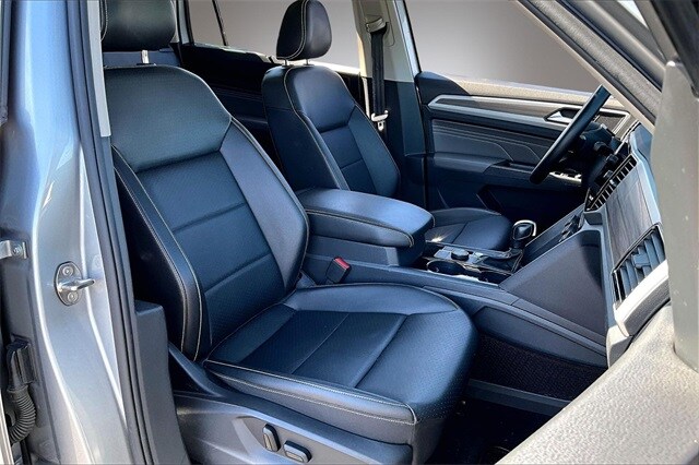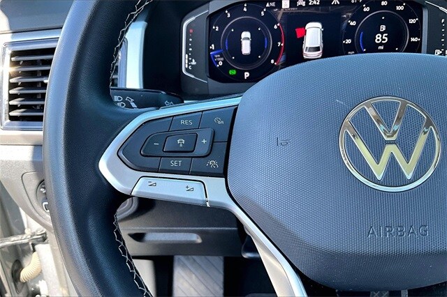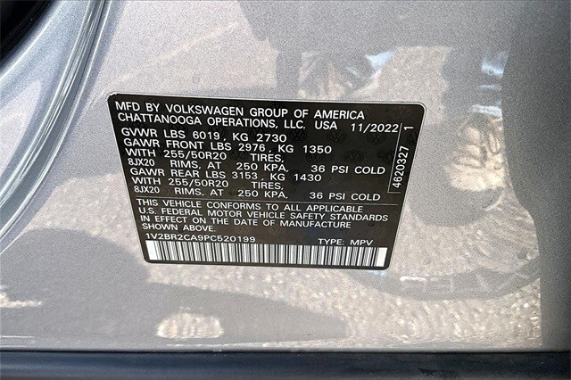 3.60 Axle Ratio, 3rd row seats: split-bench, 4-Wheel Disc Brakes, 6 Speakers, ABS brakes, Air Conditioning, Alloy wheels, AM/FM radio: SiriusXM with 360L, Auto High-beam Headlights, Auto-dimming Rear-View mirror, Automatic temperature control, Brake assist, Bumpers: body-color, Compass, Delay-off headlights, Driver door bin, Driver vanity mirror, Dual front impact airbags, Dual front side impact airbags, Electronic Stability Control, Emergency communication system: VW Car-Net Safe & Secure 5-year, Exterior Parking Camera Rear, Four wheel independent suspension, Front anti-roll bar, Front Bucket Seats, Front Center Armrest, Front dual zone A/C, Front fog lights, Front reading lights, Fully automatic headlights, Heated Comfort Front Bucket Seats, Heated door mirrors, Heated front seats, Heated steering wheel, Illuminated entry, Leather Shift Knob, Low tire pressure warning, Memory seat, Navigation System, Occupant sensing airbag, Outside temperature display, Overhead airbag, Overhead console, Panic alarm, Passenger door bin, Passenger vanity mirror, Perforated V-Tex Leatherette Seating Surfaces, Power door mirrors, Power driver seat, Power Liftgate, Power moonroof: Panoramic, Power passenger seat, Power steering, Power windows, Radio data system, Radio: MIB3 Discover Media w/8" Touchscreen Nav, Rain sensing wipers, Rear air conditioning, Rear anti-roll bar, Rear reading lights, Rear seat center armrest, Rear window defroster, Rear window wiper, Remote keyless entry, Security system, Speed control, Speed-sensing steering, Split folding rear seat, Spoiler, Standard Suspension, Steering wheel mounted audio controls, Tachometer, Telescoping steering wheel, Tilt steering wheel, Traction control, Trip computer, Turn signal indicator mirrors, Variably intermittent wipers, and Wheels: 20" x 8J 5-Spoke 2-Tone Machined Alloy.